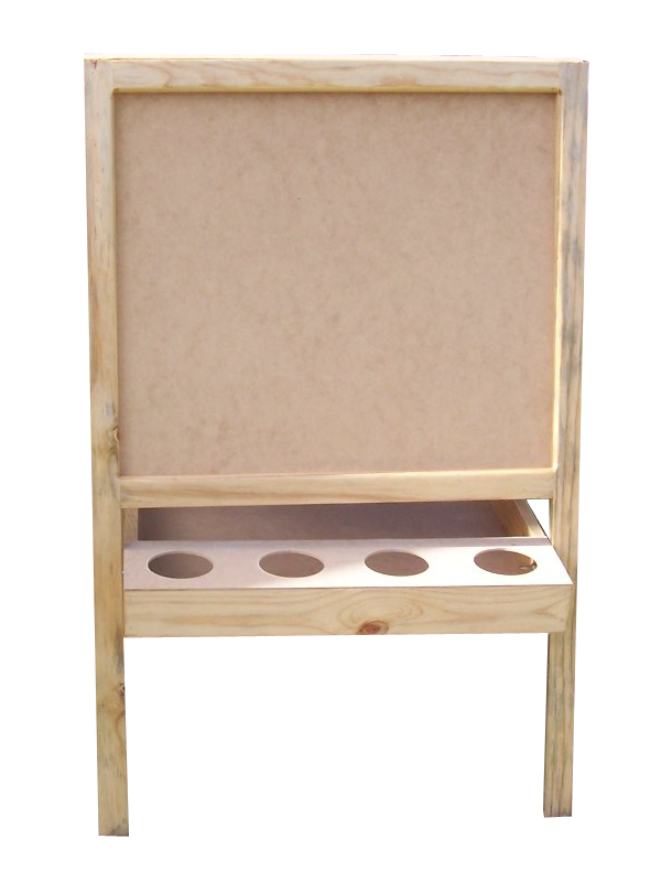 Made solid and built to last, this two sided easel - one chalkboard, one painting. Clip on one side allows paper to be kept still whilst painting. Folds together for easy storage. Large storage area is great to keep supplies close or completed artwork. Holes are cut for non-spill paint pots (accessories not included). Please feel free to contact us if you would like a quote on a different design or size.